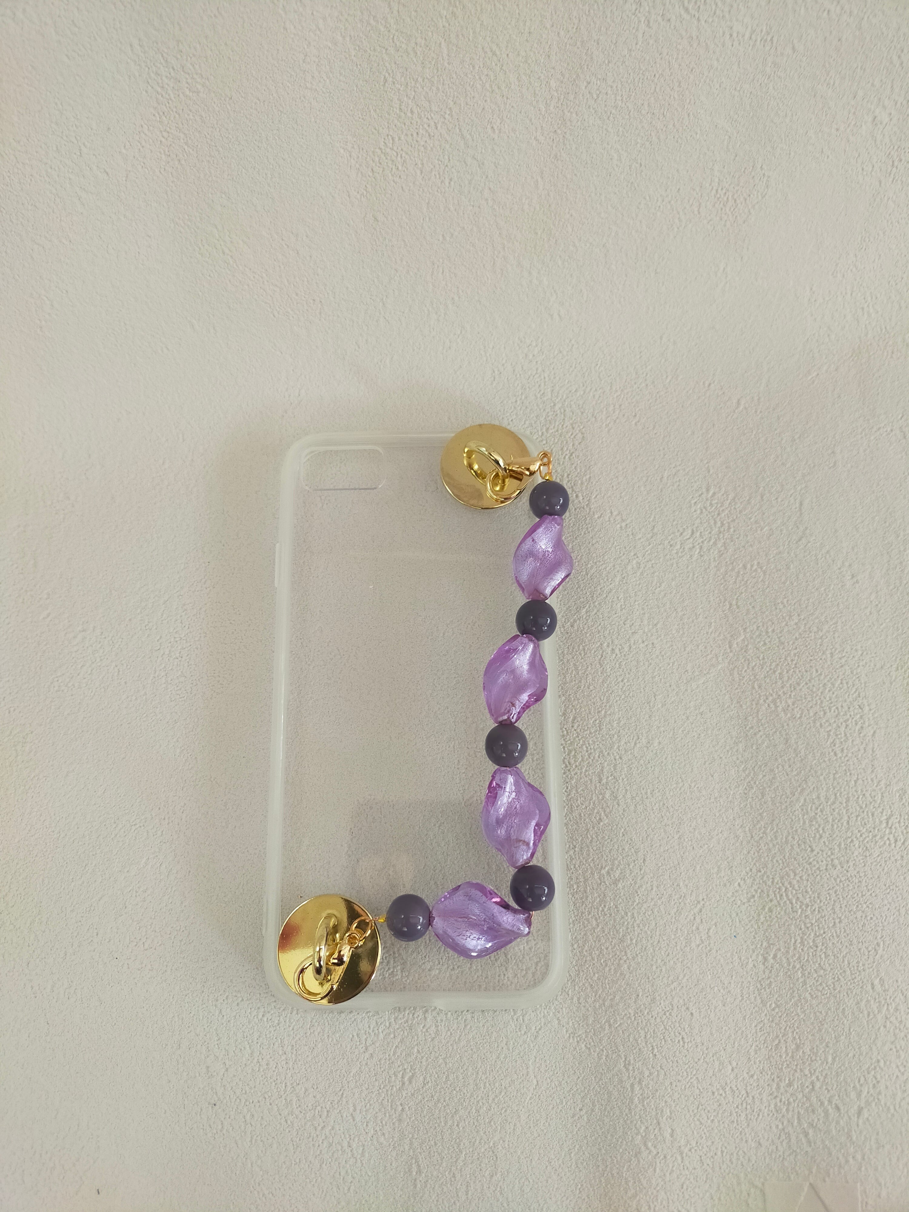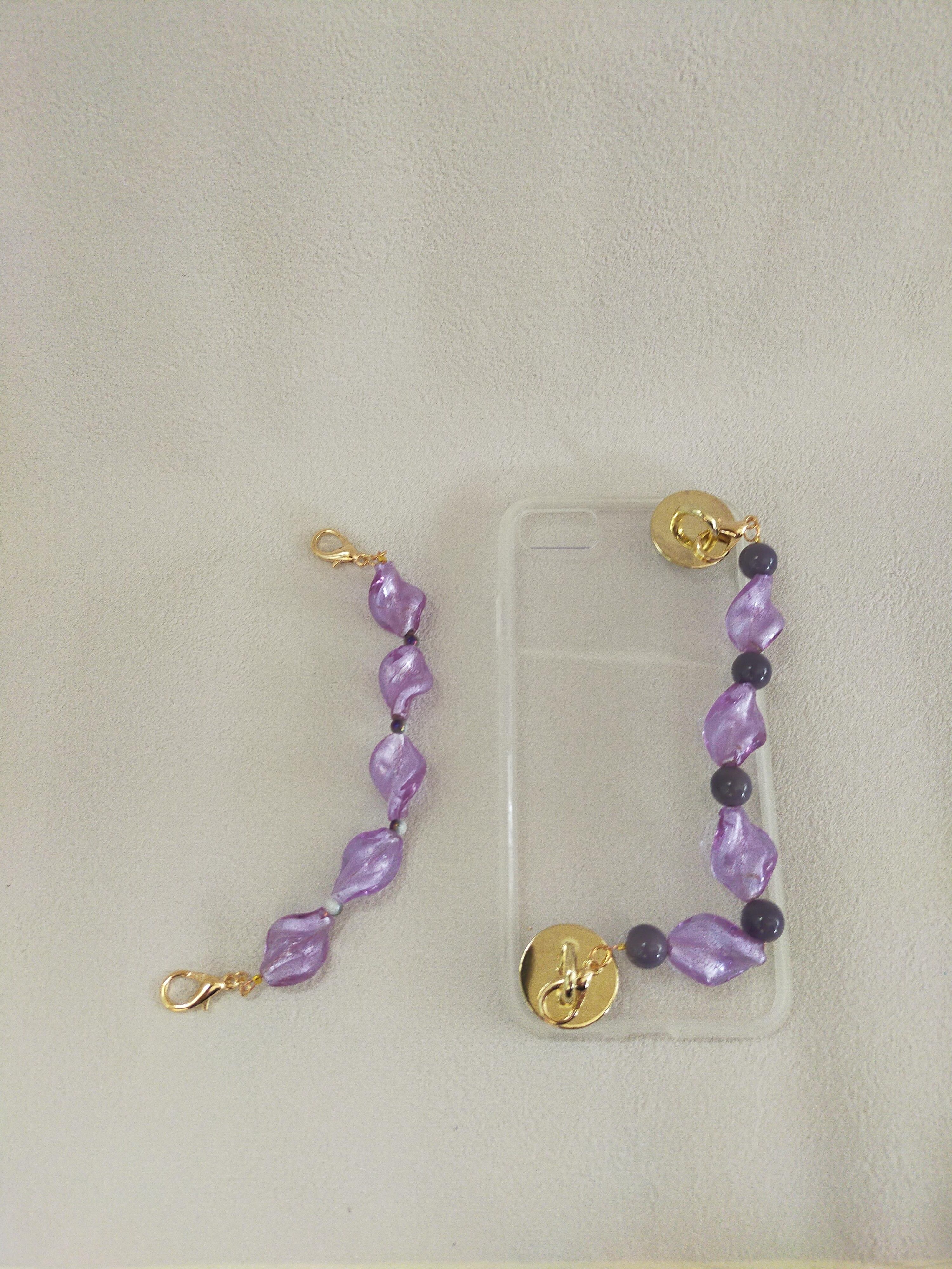 大人の雰囲気と気品があふれるひねりガラスと、まるで沖縄のぜんざいを思わせるマットな紫色のガラスビーズを組み合わせた、上品で個性的なさ印象のスマホストラップで、さりげないながらも存在感を放ちます。