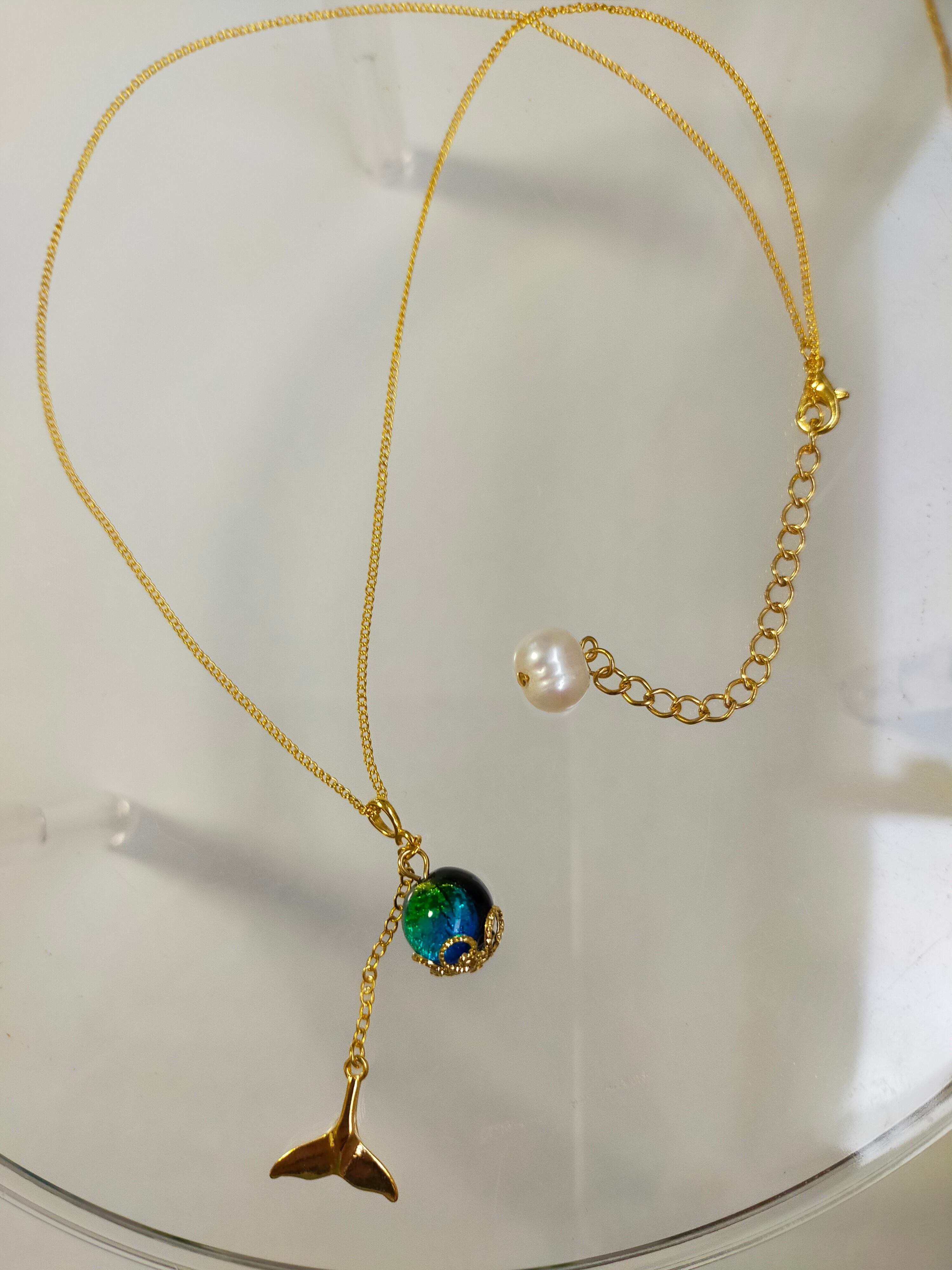 淡水パールと蓄光ホタル玉10mmとクジラ尾チャームを組み合わせて作成したネックレスです。