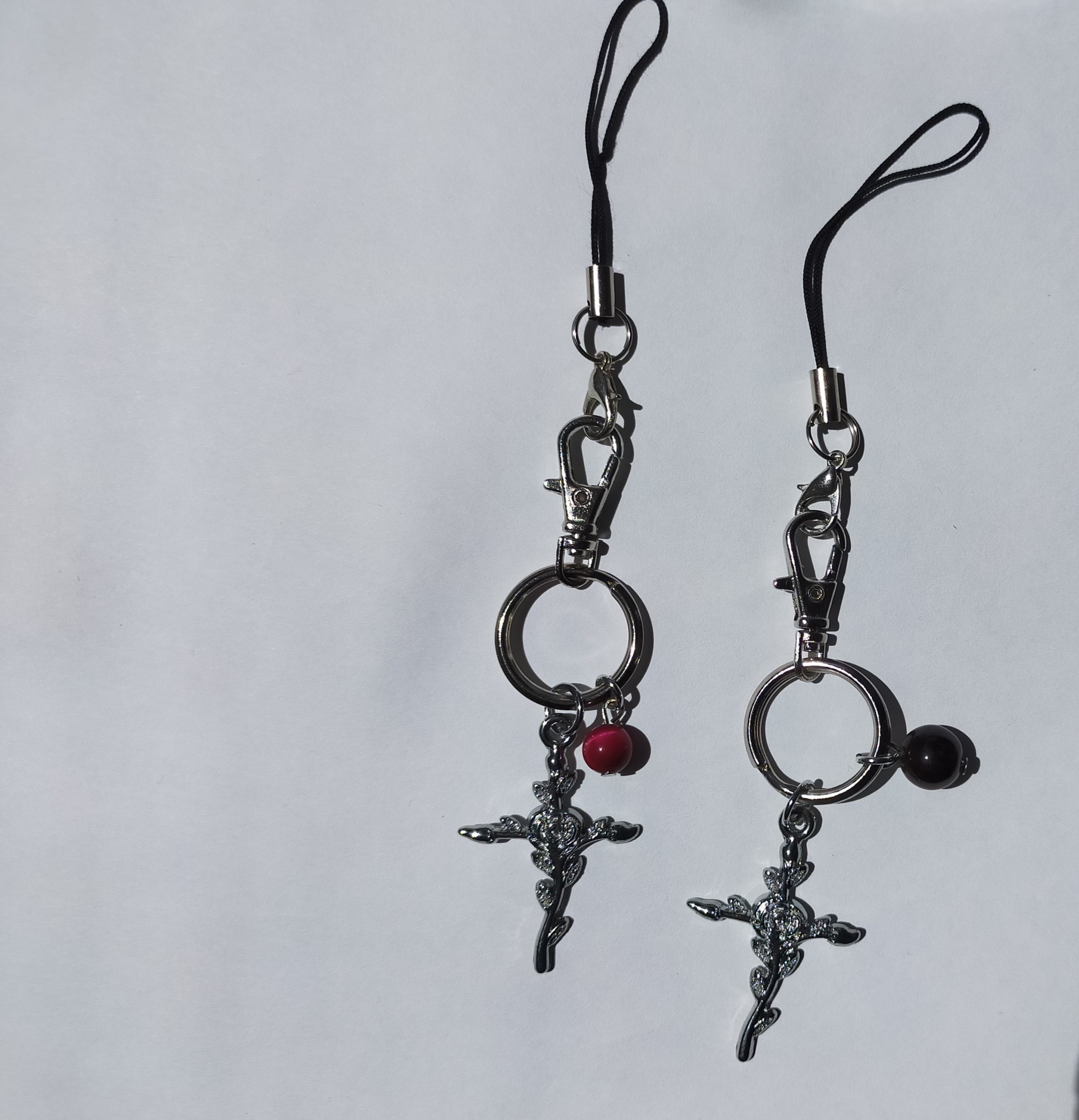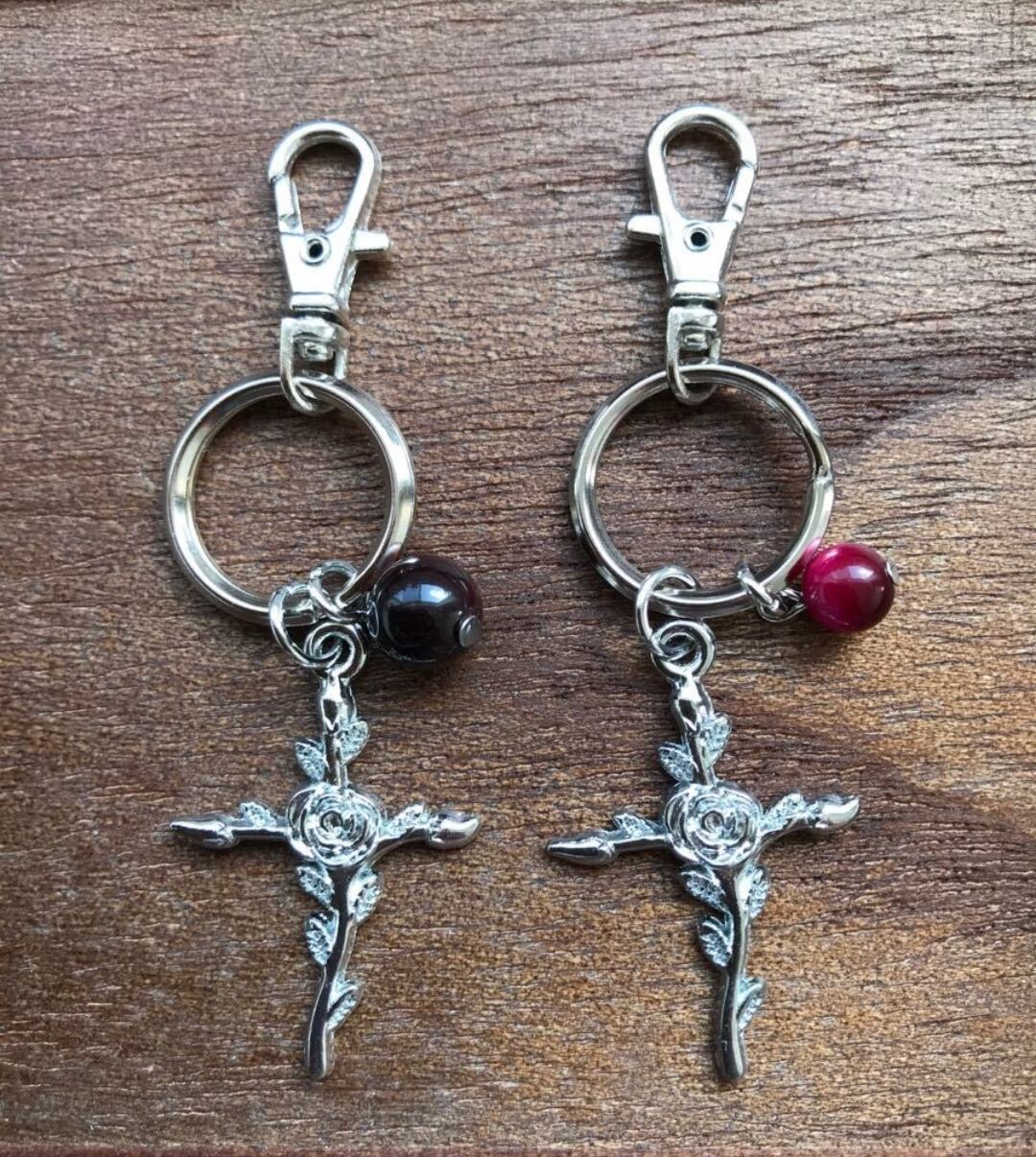 薔薇の十字架チャームとタイガーアイを組み合わせて作成したハンドメイドのペアのバッグチャームです。