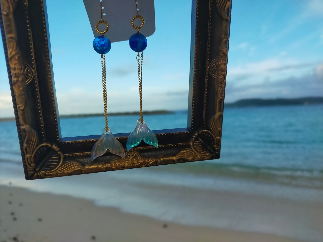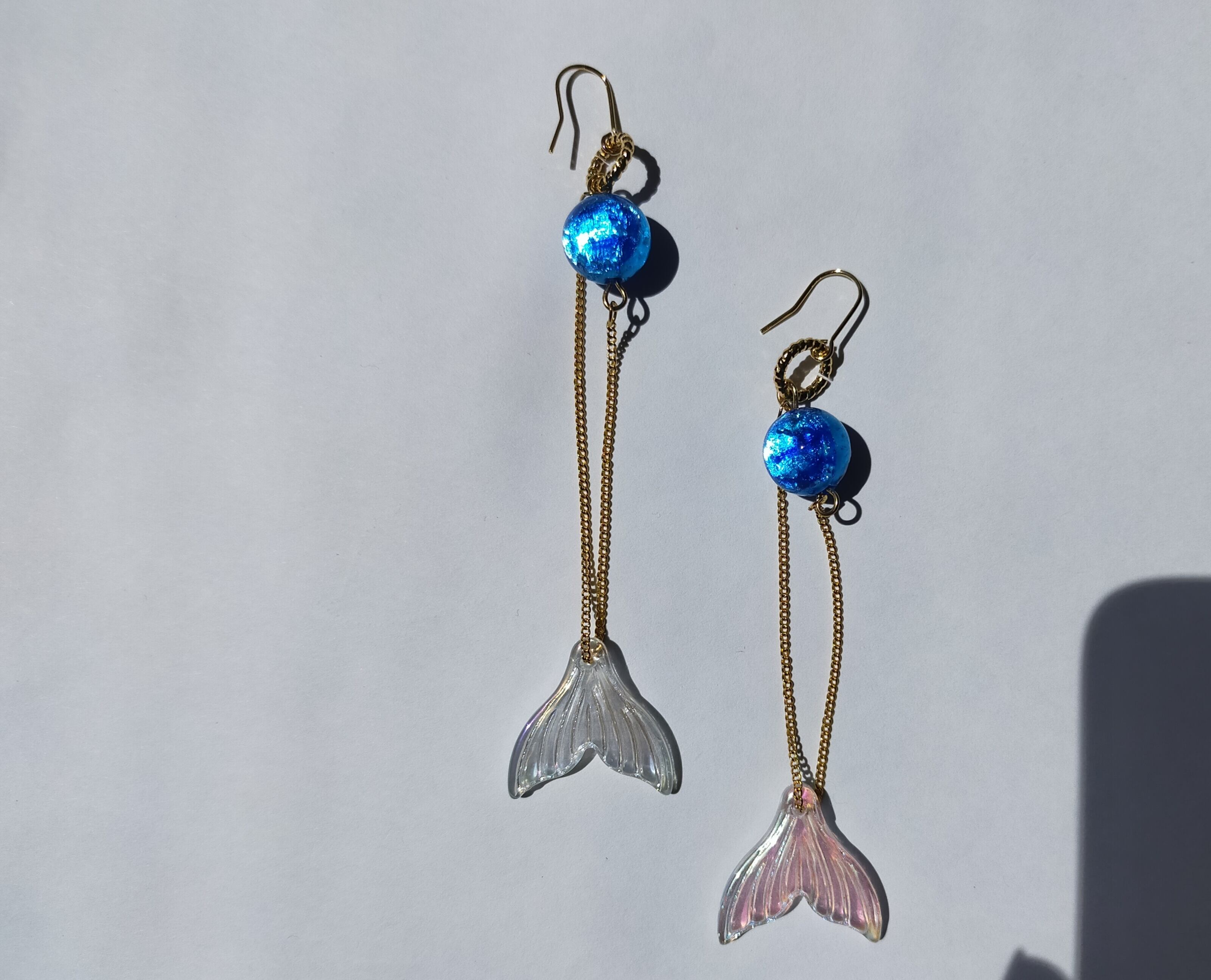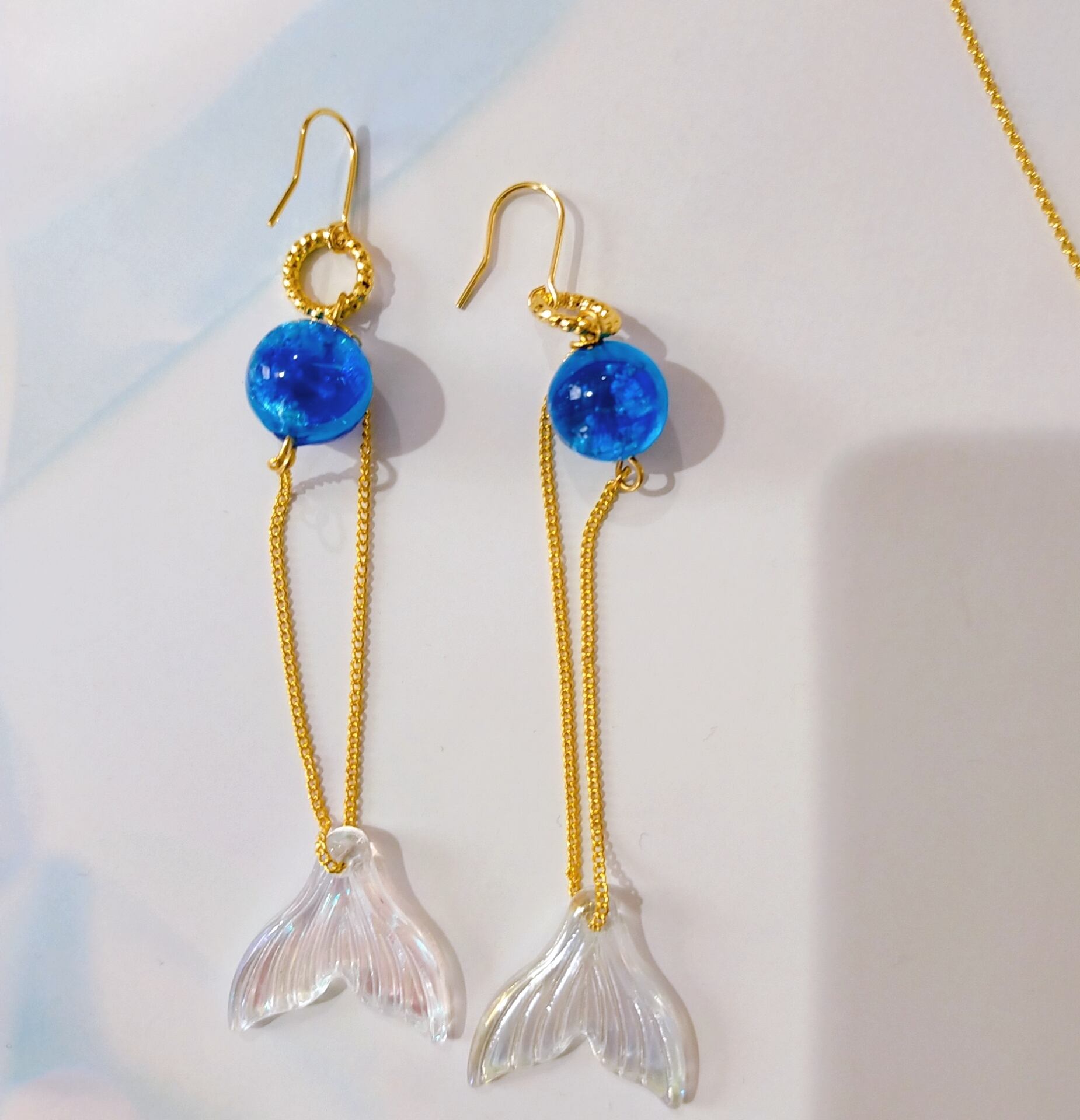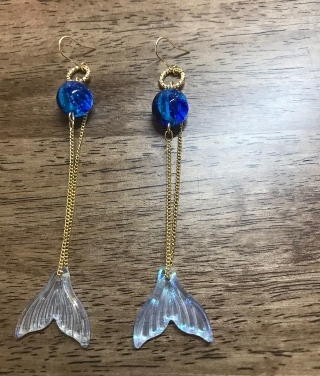 ホタル玉とマーメイドチャームを組み合わせて作成したフックピアスです。