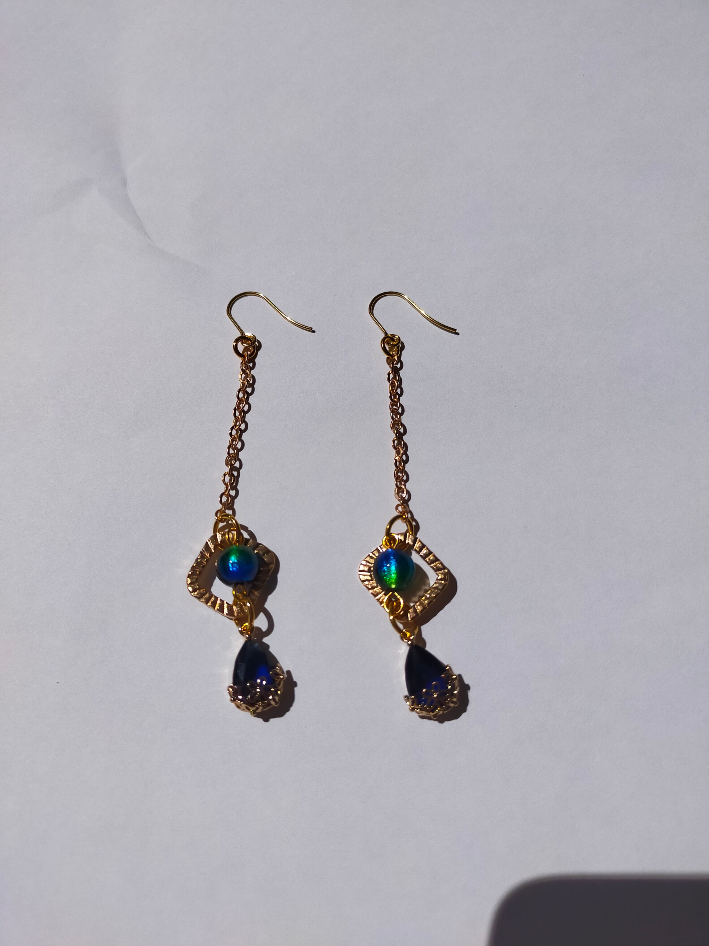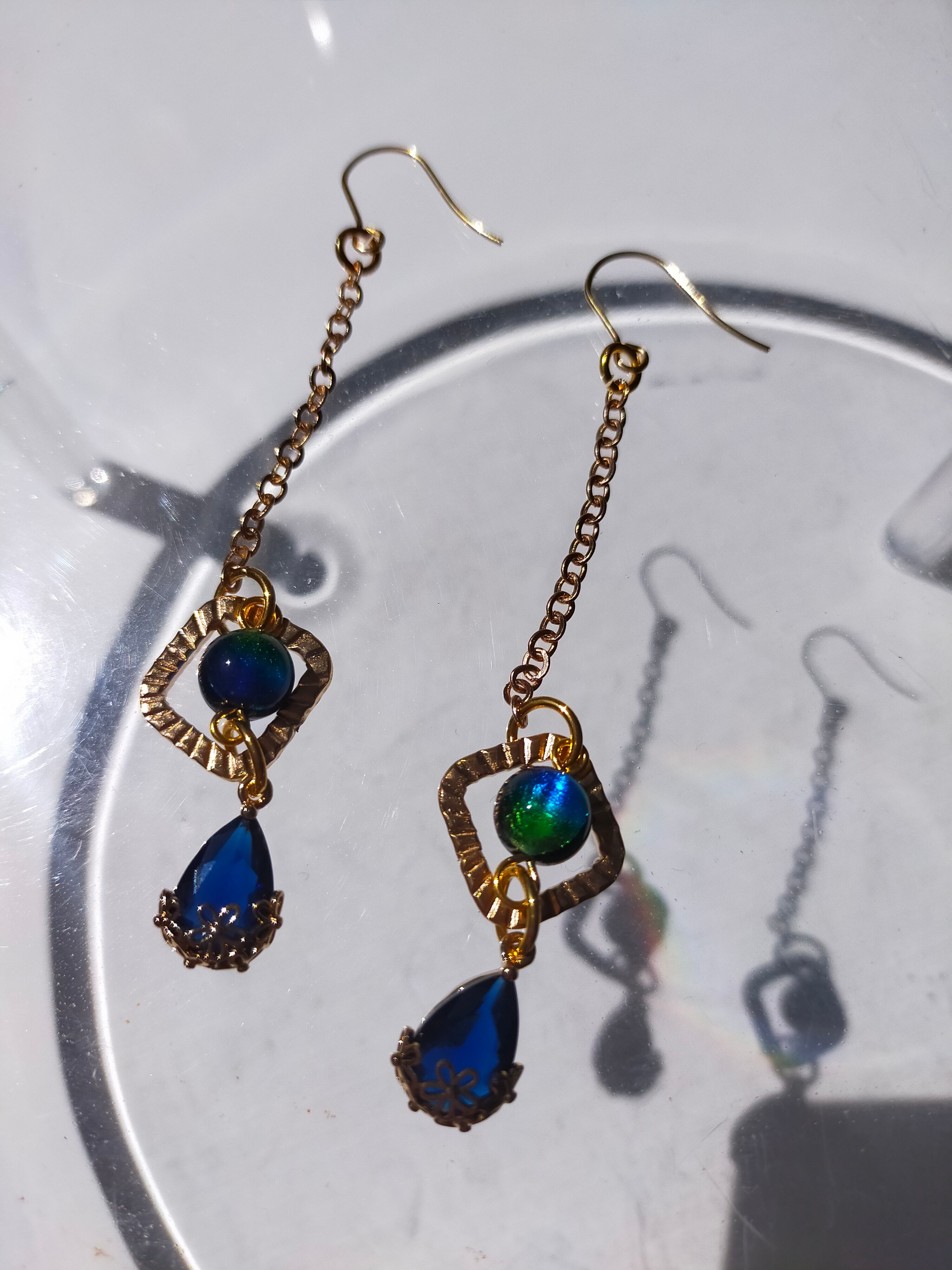 8mmのホタル玉とガラス製ストーンを組み合わせて作成した個性的なピアスです。