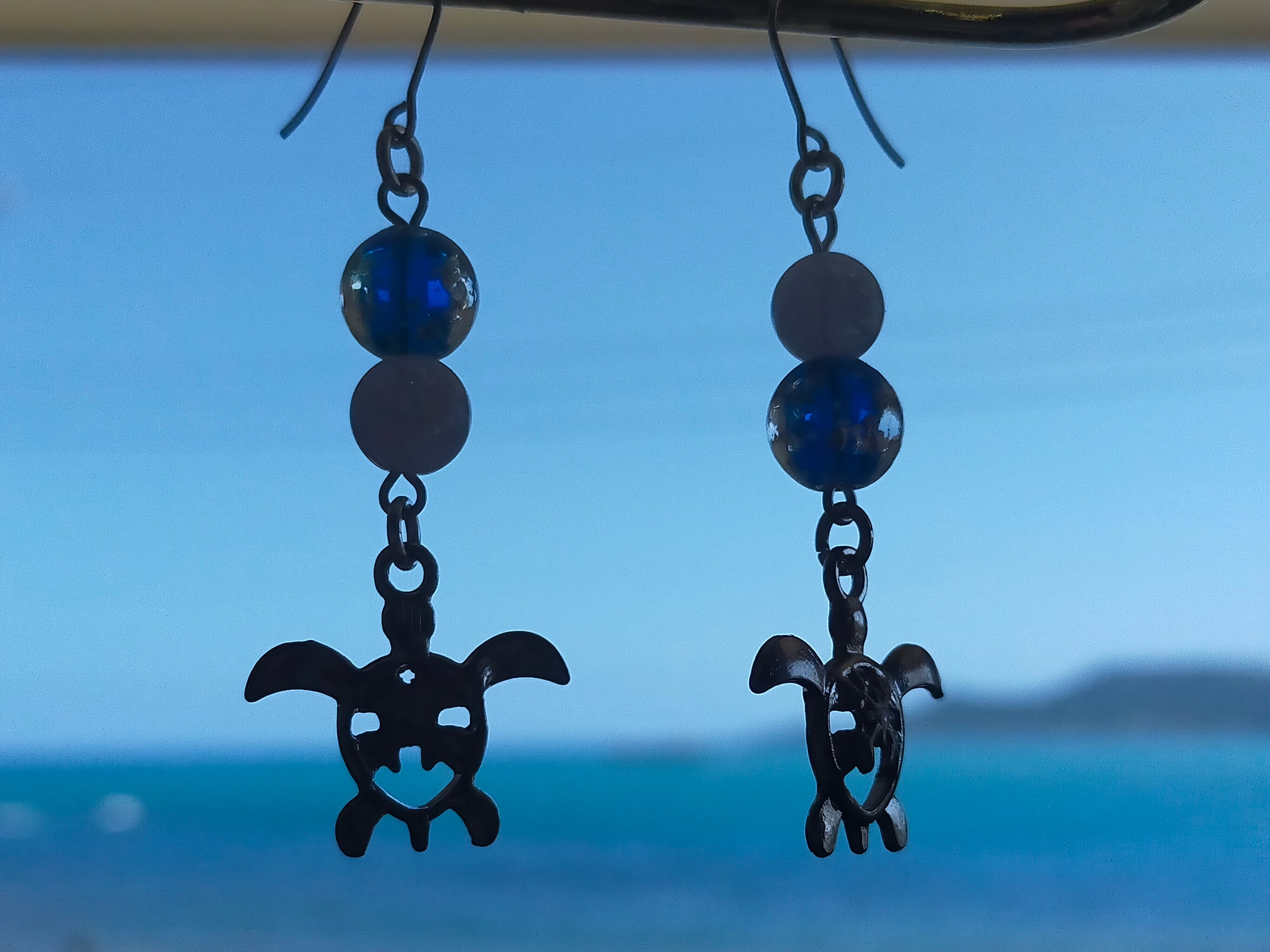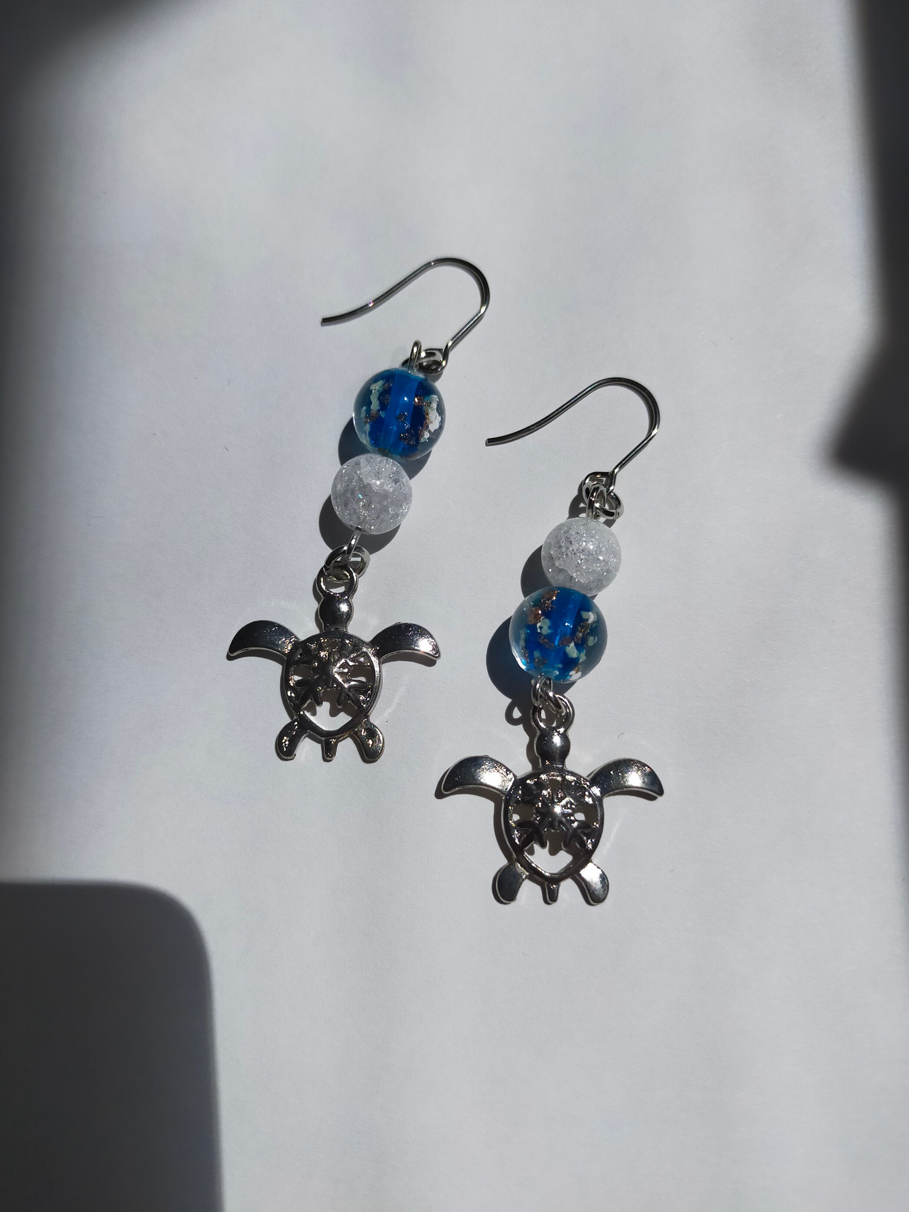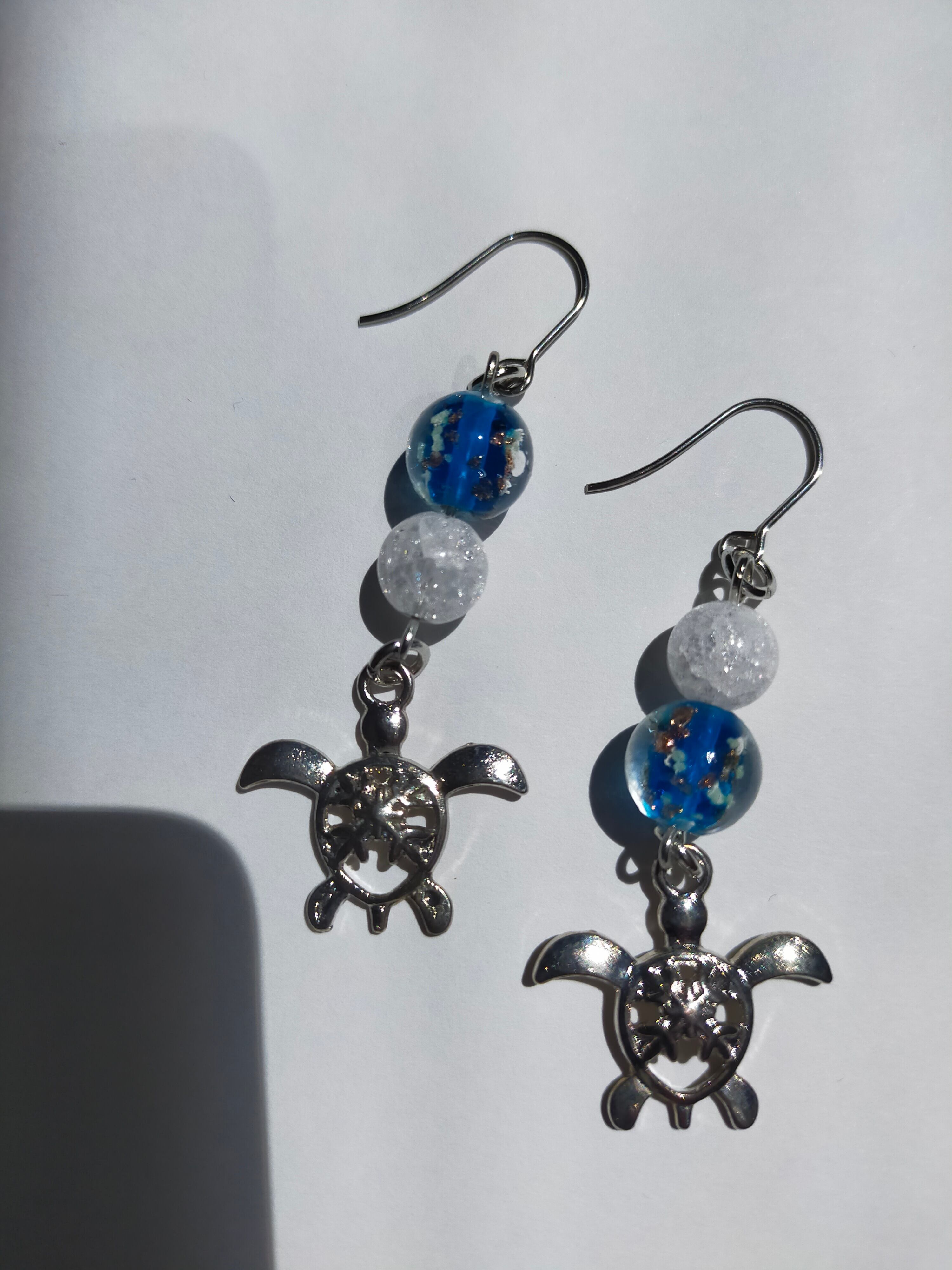 青色の蓄光ホタルガラス10mmとクラック水晶と海亀を組み合わせて作成したサージカルステンレス素材のフックピアスです。